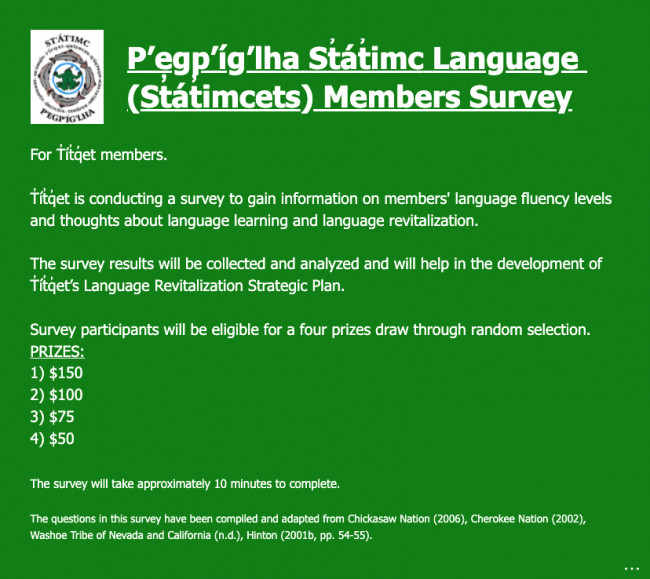T̓ít̓q̓et Members – St̓át̓imcets Survey K̓alhwá7alap Nsnek̓wnúwa7 (Hello Friends and Family) The P’egp’íg’lha Language Revitalization Group (PLRG) received funding from the First Peoples’ Cultural Council (FPCC) to draft a Language Revitalization Strategic Plan. It is very important to obtain as much input from T̓ít̓q̓et Members to include within the Language Revitalization Strategic Plan. The first things that needs to be…